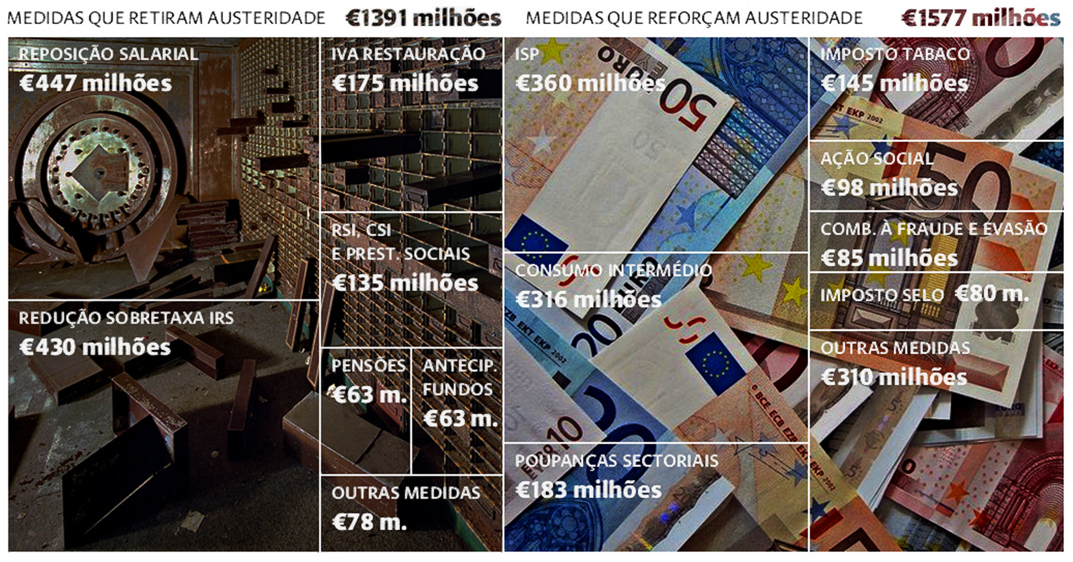 As medidas que retiram a austeridade contabilizam-se em 1391 milhões de euros, enquanto as medidas que reformam a austeridade contabilizam-se em 1577 milhões de euros.